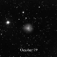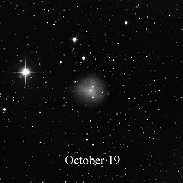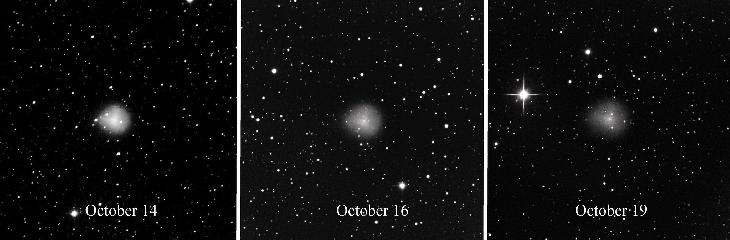 Comet 29P/Schwassmann-Wachmann centered. Initially observed as a compact bright object, the expanding coma is gradually becoming more transparent to the background stars. All images captured with iTelescope T11 (0.5 M Planewave), with the initial outburst a 300 sec image due to rapidly changing clouds and only a single useable image, while the other images a stacked total 480 sec with 120 sec subs. The uneven date sequence is due to clear sky being available. This is the brightest outburst in 40 years. As of October 16 the coma appears to be rapidly thinning with a significant change since October 14th. Note the much fainter stars are now shining through the coma that shows how much more transparent it has become in just two days. By October 19th it is faded even more. Story in spaceweather.com spaceweatherarchive.com/2021/10/14/volcanic-comet-blows-i...