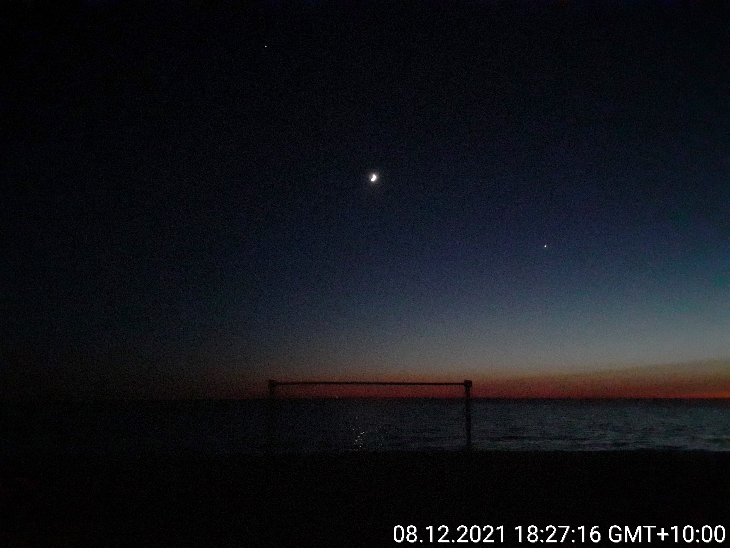 On December 8, 2021, from my small homeland - Yuzhno-Morskoy (Nakhodka, Primorsky Krai, Russia), above the Sea of Japan, I took (using mobile phone camera) this my photo of waxing crescent Moon with Venus, Saturn (the lowest brightness of all in this photo, on the right above near the Moon) and Jupiter; and my video https://www.youtube.com/watch?v=SQmb64NUv6E of the ISS pass - little over 4 hours before docking of Soyuz MS-20. I took the video (the original of this my video lasts more than 6 minutes and has audio comments in it) with mobile phone camera in the evening (the sky was clear) when my son Filipp Romanov - amateur astronomer and discoverer of variable stars - was taking photos https://spaceweathergallery.com/indiv_upload.php?upload_id=180244 of the ISS pass (with his Canon EOS 60D camera).