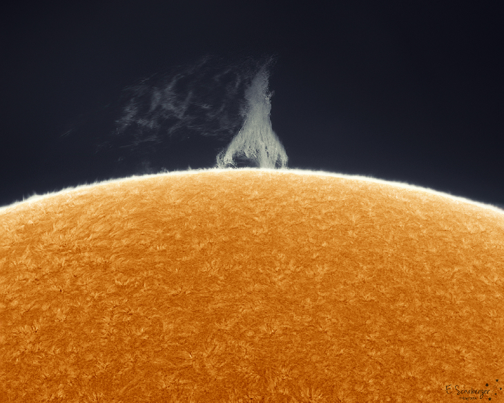 This Sunday the huge prominence that can be seen in the southeastern limb of the sun changed its shape compared to Saturday and now looks much more like a pine tree. Although the seeing this morning was very poor, I did not want to miss out on photographing this amazing prominence.