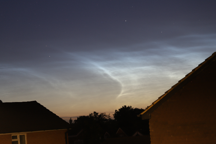 Noctilucent cloud display 0145 - 0345 BST (0045 - 0245 UTC) seen from Berkshire in southern England, UK (Latitude 51.42 N). These photos taken at 0239, 0258 and 0328 BST (0139, 0158 and 0228 UTC).