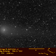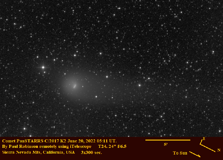 Taken remotely using iTelescope T24 in California (24 inch reflector at f6.5). June 20, 2022 05:11 UT. 3x300 s luminance. Note that the tail points TOWARD the sun. Earth was crossing the comet's orbit this day.
