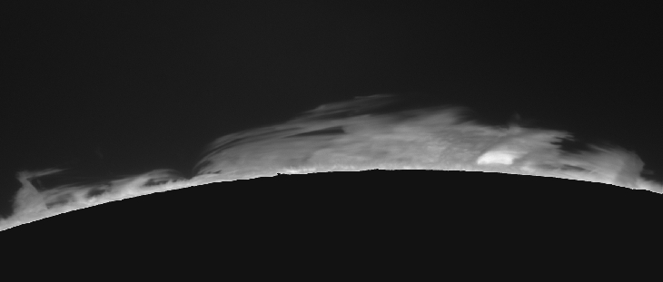 The huge filament of the past week is now completely off the sun's disk and has completely transitioned to a prominence. It's not tall, but it is wide! Sunspot 3038 is nearing the edge of the sun. 127mm f/9.4 refractor, Daystar Quark Chromosphere filter, ZWO ASI174mm camera.