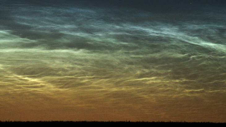 What colour are noctilucent clouds? The usual colour is blue and perhaps yellow when viewed close to the horizon, but what about green? I caught this display from North Yorkshire, UK on 23 June 2022 at 00:05 UT. The clouds near the horizon were tinged yellow and those higher up the usual blue colour. However, in the transition area between the two bands, the noctilucent clouds were a distinct green colour. I've never seen this before and it made for a memorable display. This shot was taken with a tripod mounted Canon 250D DSLR at 1.6s exposure, 170mm focal length, f/5, ISO-800.