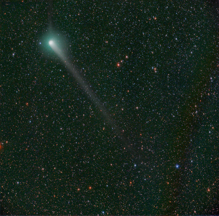 In the hope of also capturing something of the developing ion tail (erected in the direction of 12 h), I exposed comet C/2017 K2 (PANSTARRS) from Alhama de Granada (Andalusia/Spain) again for a whole night. The dust tail also already has a considerable length. Unfortunately, there was already some Sahara sand in the air last night, which reduced the contrast a bit.