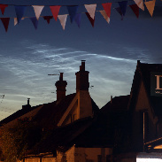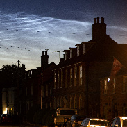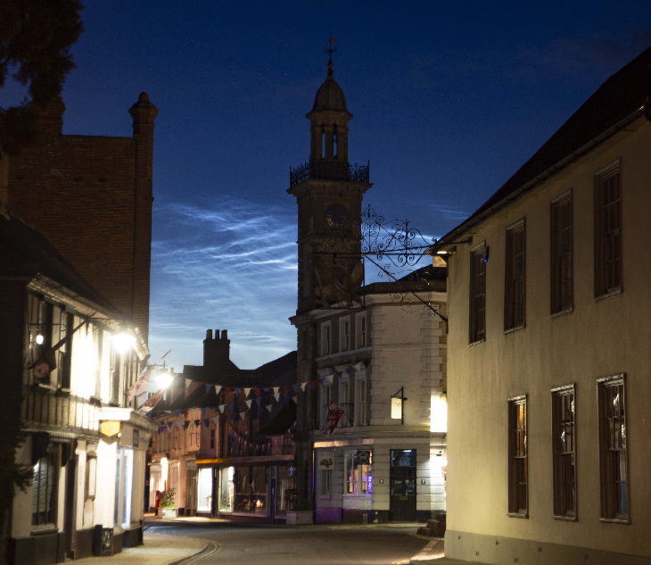 A vivid long-lasting display of NLCs spread across the whole north to east sky up to about 30 degrees over eastern England. Emerging immediately after dusk they lasted throughout the night until overwhelmed by the dawn. They provided an interesting backdrop to Harleston town centre (c52 degreesN) on a walk through its historic streets at 02.00UTC (03.00 BST)