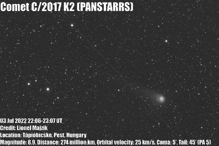 Comet C/2017 K2 (PANSTARRS) Jul 03, 2022 22:06-23:07 UT from Tápióbicske, Pest, Hungary. Equipments: Sky-Watcher Esprit 80ED, ZWO ASI 183MM Pro, 13 x 120 sec Lum, Gain 111
