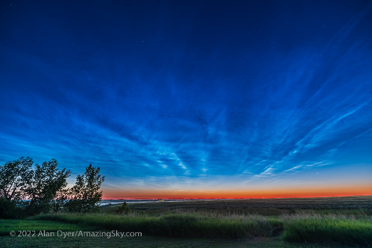 This was the best showing of noctilucent clouds I had seen to date from Alberta, Canada for this year. At dawn on July 16 the NLCs extended far up the sky, to the zenith before the brightening dawn sky washed them out. This was the first display I had seen so far this year to cover as much of the sky as this, essentially half the sky and more.