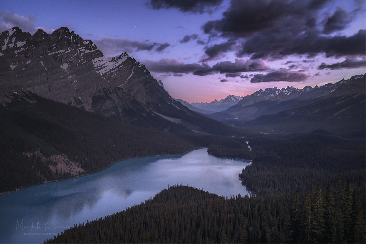 The ever famous Peyto Lake in Canada with a few Noctilucent clouds becoming visible before sunrise. This is a stunning location, and was thrilled to see these clouds peeking through the other clouds!