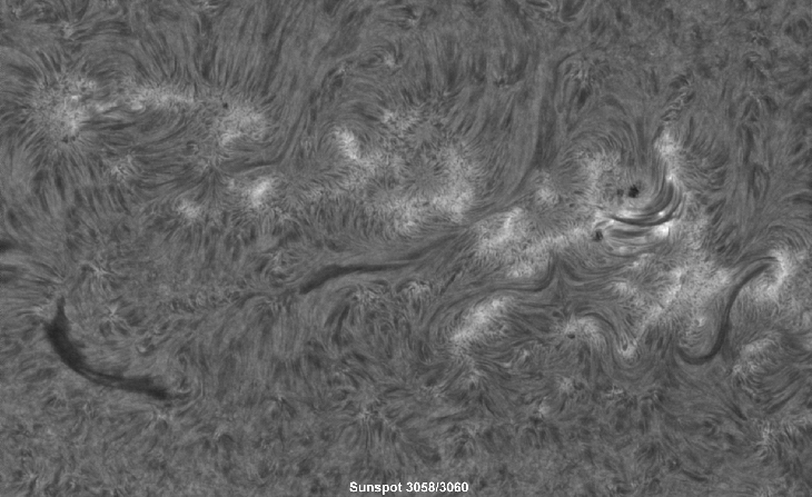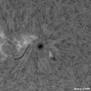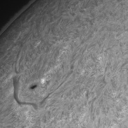 The sun today displayed some nice sunspots plus a large, faint prominence. 127mm f/9.4 refractor, Daystar Quark Chromosphere filter, ZWO ASI174mm camera.