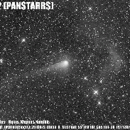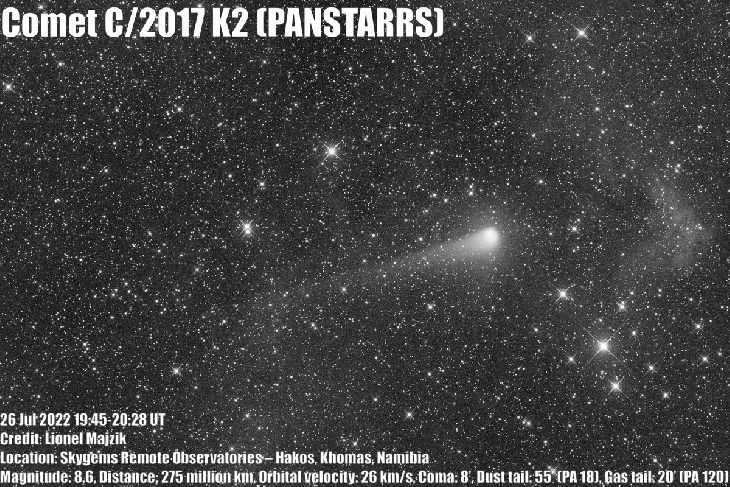 Comet C/2017 K2 (PANSTARRS) and LBN 35 Jul 26, 2022 19:45-20:28 UT from Hakos, Khomas, Namibia. Equipment: Skygems Remote Observatories - ASA H8 Hyperbolic 203/592 mm, QHY 600M, f/2.9, 4 x 180 sec Lum