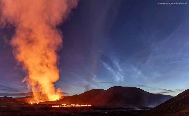 Yesterday around 2 at night I was lucky to see the erupting volcano on the Reykjanes Peninsula in Iceland ánd see noctilucent clouds for the first time ever! What a wonderful combination!