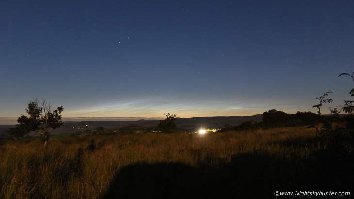 Noctilucent Clouds from near Beaghmore, Co. Tyrone last night (Aug 11th/12th). A rare late season display, possibly related to rocket launches seeding the Mesosphere with ice crystals, this ranks in my personal observing records as the latest season NLCs I've ever seen since I began observing them in 2000. Images are very rushed, literally pulled over at side of road and jumped into some marsh land. Type 3 brightness, 7 degrees high, 60 degrees in length, veil and bands structures. 18mm and 50mm lenses, ISO800, 5 secs, then 4 secs ISO400.