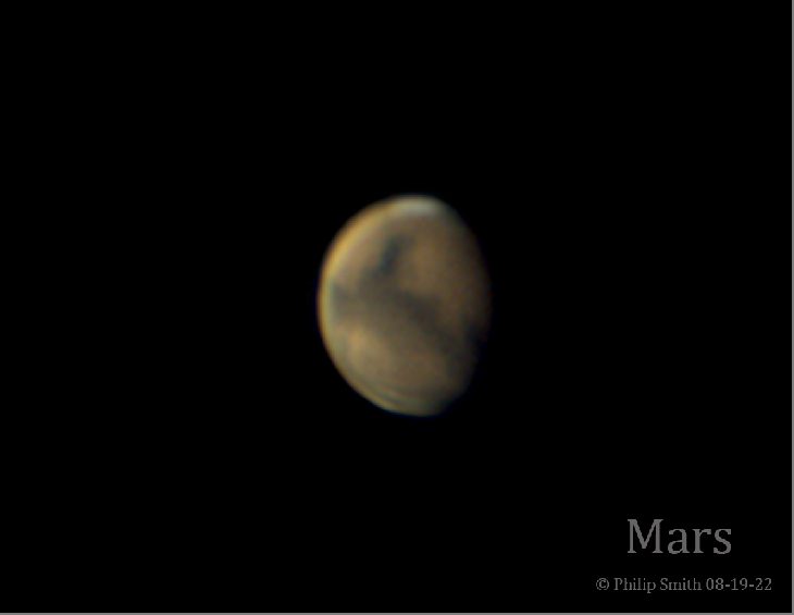 I imaged Mars on the morning of 08-19-22 from my observatory in Manorville, NY. My imaging setup was a ZWO ASI224 MC camera with a UV/IR cut filter and a ZWO (ADC) 1.25" Atmospheric Dispersion Corrector adapter in a Baader Planetarium Carl Zeiss 2x Barlow Lens all in a MoonLite focuser. My telescope was an Edge HD 14'' OTA on a AP1600GTO mount. The seeing was between a 2/5 to 3/5 .