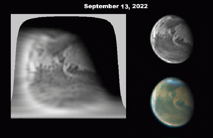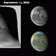 A Martian cold front is seen moving south on Sept 13 and 14 out of the north polar region. Sept 15 shows dust behind the front but the front itself has stopped raising dust as it moved south.