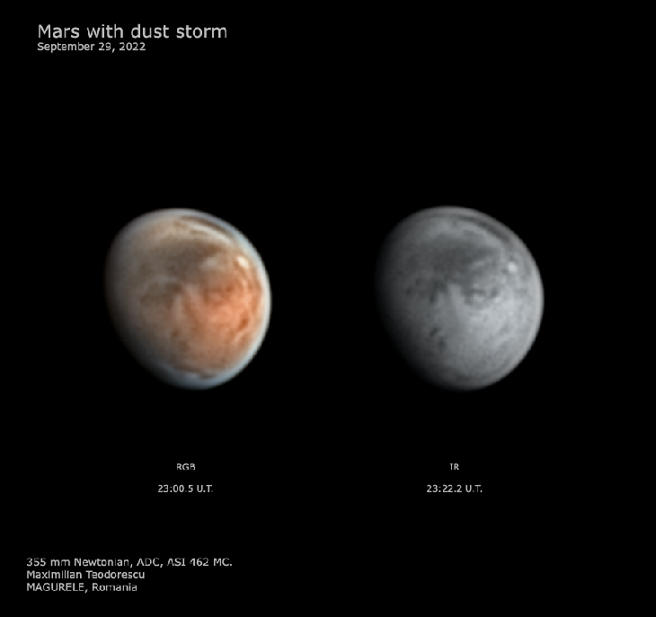 A large dust storm is visible for some days now on Mars, and this is my first image of it. Poor seeing but a lot can be seeing, as the lack of contrast, a bright spot near the limb and lots of missing features near Solis Lacus.