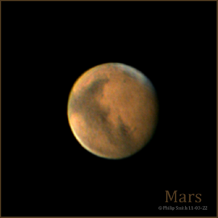 I imaged Mars on 11-03-22 from my Manorville NY observatory. The seeing was average. This image is not that great but I thought I would share it with you anyway. My imaging setup was a ZWO ASI224MC Color Camera with a UV/IR cut filter and a ZWO (ADC) 1.25" Atmospheric Dispersion Corrector adapter in a Baader Planetarium 2x Barlow Lens all in a MoonLite focuser. My telescope was an Edge HD 14'' OTA on a AP1600GTO mount. Kind Regards to ALL 🙂