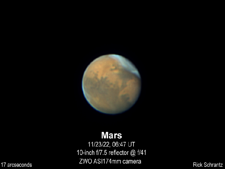 Mars was showing off its north polar hood early this morning. Only 2 weeks until opposition! 10-inch f/7.5 homemade reflector @ f/41. ZWO ASI174mm camera.