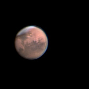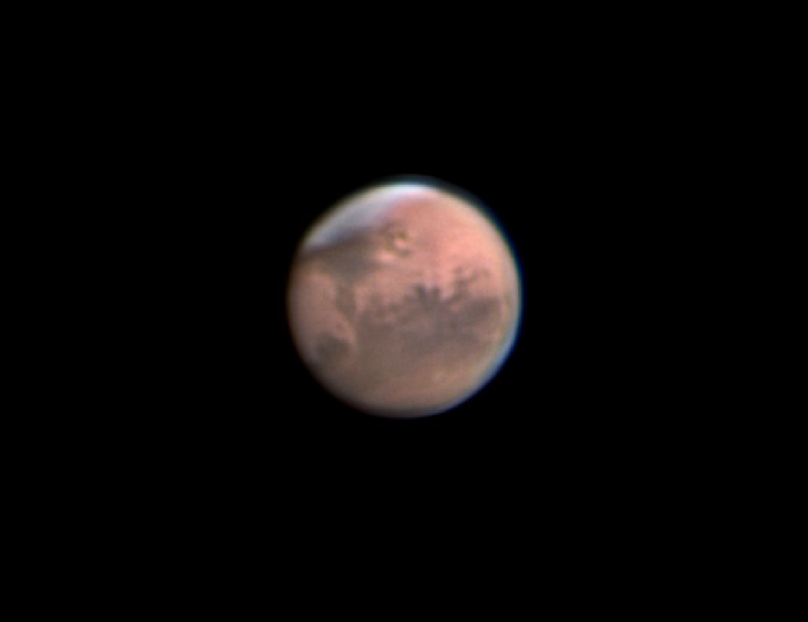 Mars 221123.0708 UTC: mag = -1.7, size = 17" and CM = 43 degrees; main features (Mars Profiler) North: ice and Mare Acidalium; South: Mare Erythraeum and Solis Lacus (aka "Eye of God") - Meade 10" LX200 @ f/25, ZWO ADC, ZWO ASI290MC, AutoStakkert, RegiStax and PaintShop Pro