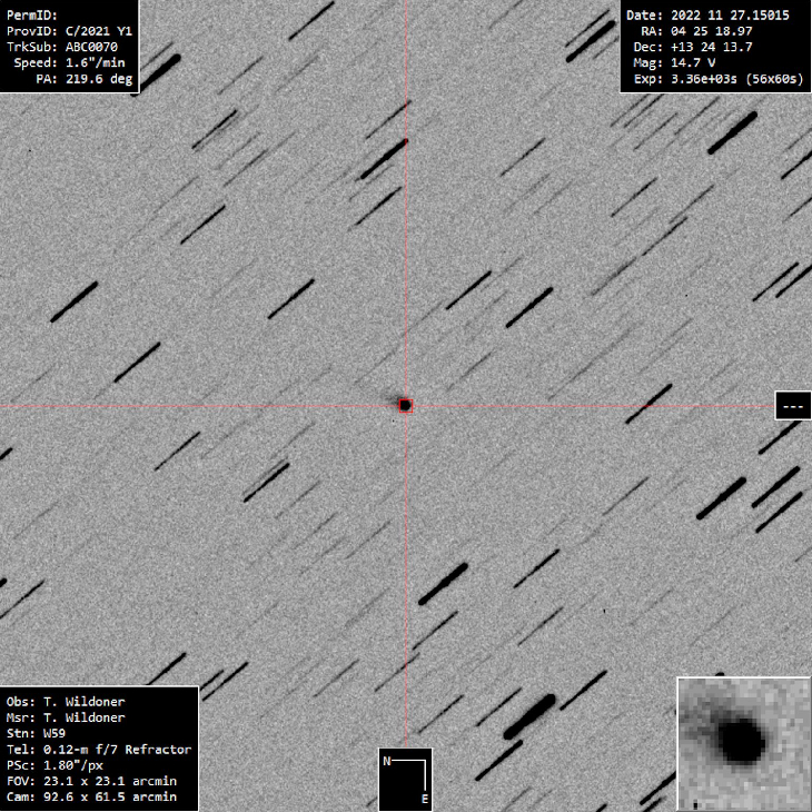 Here is Comet C/2021 Y1 (ATLAS) as observed last evening in the constellation Taurus. Object: C/2021 Y1 (ATLAS) Right Asc: 04h 25m 15.6s Decl: 13° 23' 30.0" (J2000) Magnitude: 15.06 Altitude: 60° Solar Elongation: 171.6° Constellation: Tau Sun distance: 407.39 Million Km Earth distance: 260.77 Million Km * Data from TheSkyLive.com Tech Specs: Sky-Watcher Esprit 120ED Telescope, ZWO AS2600mc-Pro running at -10C, Celestron CGEM-DX mount, 56 x 60 second guided exposures, focused with a ZWO EAF, controlled with a ZWO ASIAir Pro. Processed using Tycho Tracker. Image Date: November 26, 2022. Location: The Dark Side Observatory (W59), Weatherly, PA, USA (Bortle Class 4).