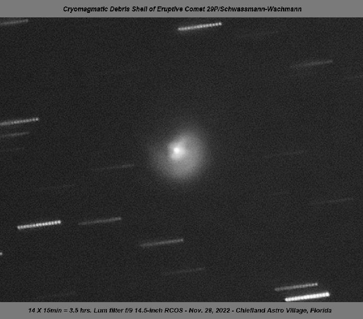 I was awestruck seeing the images of cryovolcanic Comet 29P/Schwassmann-Wachmann as shown on Spaceweather.com Nov.23-26, 2022!! So I decided to check it out for myself. To my amazement, even short exposures with my 14.5-inch RCOS telescope at the Chiefland Astro Village divulged an irregular shape and "cavities" within the "cryomagma shell"!! You don't need a 2.2 meter telescope on a volcano in the Pacific to witness this phenomenon. And, unlike Asteroid System Didymos-Dimorphos, this comet is moving so slowly against the background stars that I took fourteen 15-minute subs at 3310 mm focal length to create a 3.5 hour exposure! Why did I do that, you ask?! Because I could! :)