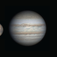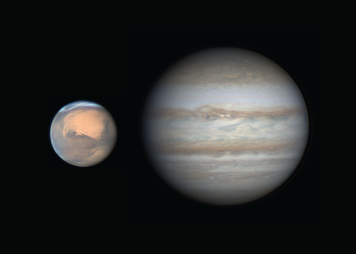 Jupiter and Mars at the same relative apparent size as Mars makes its closest approach this year and Jupiter recedes from Earth.