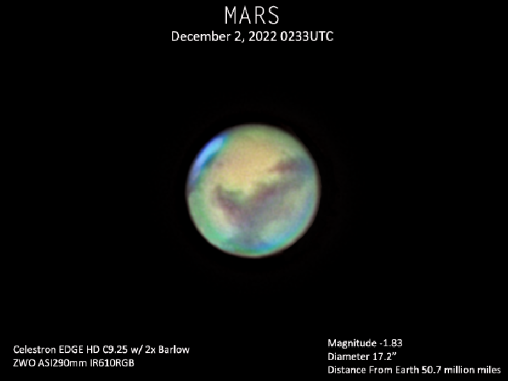 Mars has been such a wonderful beacon in the evening sky, positioned perfectly among the bright stars of the Winter Sky in Taurus. I had to capture it at its closest approach to Earth at only 50.7 million miles. Seeing wasn't the best here in Southeastern Pennsylvania, but Mars never ceases to impress with the Syrtis Major region front and center.