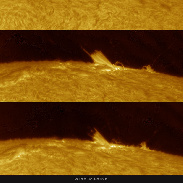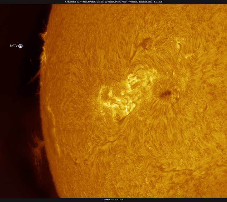 Took a look at AR3182 near the limb with proms, a surge prom was happening at the new spot crossing the limb. Captured in high res with a 150mm solar scope, double stacked.
