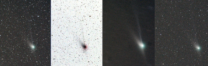 Comet ZTF was observed under near perfect skies and was moving 14 percent faster than 24 hours earlier. Although Comet ZTF was noticeably brighter, it presented a great challenge to capture it. The left image was taken with a Nikon d7100, Nikkor 180mm f/2.8 @ f/3.2, 4x240sec, iso 1600, fixed comet; the next image in the panel is an invert of the left. The 3rd image is Comet ZTF without stars using 33x240sec (note the distinct break in the ion tail). The right image is a 1x240sec (showing slight EQ Drive Mount drift). All images post-processed with PixInsight.