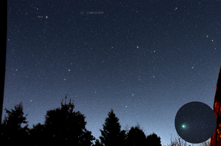 Comet C/2022 E3 (ZTF) from the dome of the observatory with a 28mm nikon wide angle and a 115/9 refractor.