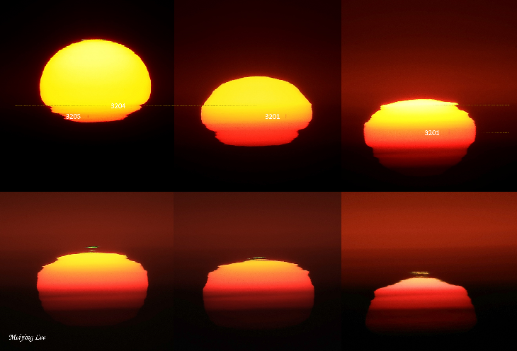 At sunset on January 30, I recorded mock mirage sunset and green flashes on Mount Hehuan at an altitude of 3,000 meters. In the mock mirage sunset formed by multiple temperature inversion layers on the high mountain, the sun has various wonderful changes. Because sunspots are very active recently, obvious mock mirage sunspots have also formed! I judged the positions of at least 3 layers of inversion layers through the positions of 3 groups of mock mirage sunspots, which are marked by horizontal dotted lines in the figure. When the top of the sun falls into the inversion layer, it produces a very obvious green flash. The video link of mock mirage sunset is as follows: https://youtu.be/AIcMZ4wjuzo