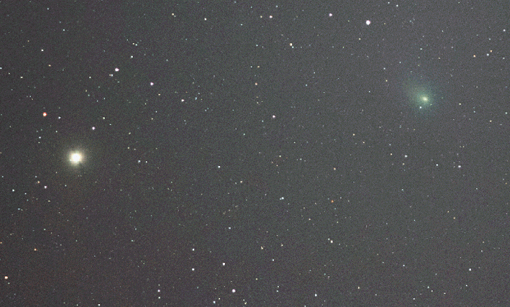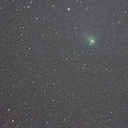 Last night I captured the comet's movement in the sky near the bright star Capella over cca. 2 hours. Conditions were rather poor with moonlight, city lights, haze and also some clouds creating an aureole around Capella. There is an electric wire passing the FOV at one point (reflecting the orange colour of street lamps) and some small skips in animation due to camera battery replacement and adjusting the focus.