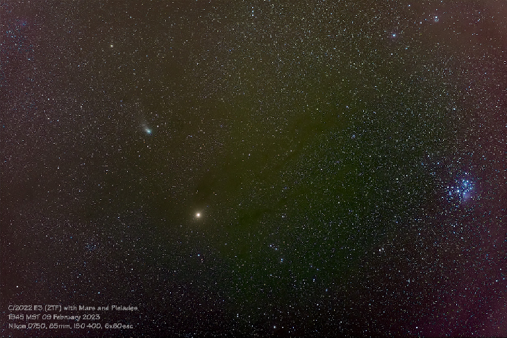 Comet C/2022 E3 (ZTF) is moving closer to Mars and Pleiades in the night sky.