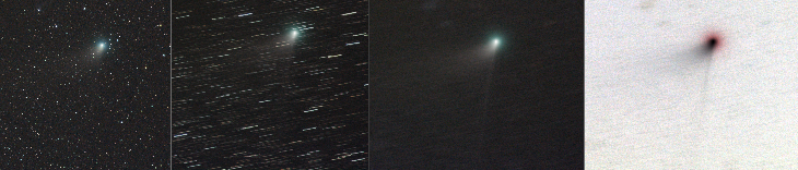 Comet ZTF was observed overhead before moonrise under 10/10 Bortle 4 skies but under breezy conditions. I was not able to see it naked eye. I'd estimate ZTF's brightness as +5.7. The ion tail and dust tail appeared a bit brighter than 24 hours earlier. The ion tail was obvious in the starless and fixed comet using 37x90s sub images but was not in the fixed star image of just 4x90s image (left). Still, it is worth a final look especially when it passes close to Mars (2/10 & 2/11). Tech Specs: Nikon d7100, Nikkor 180mm f/2.8 @ f/2.8, iso 1600, Orion Sirius EQ Mount, PixInsight. Left image is fixed stars (4x90s), the remaining images show fixed comet with stars trailing average from 7:21PM to 8:26PM an hour before moonrise. The comet was still moving at a fast 8.8 arcmin/hour or ~3.5 degrees per day