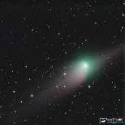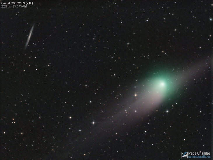 Comet C/2022 E3 (ZTF) imaged on January 23, 2023 with a brightness at magnitude 5.6, just when it was in conjunction with the spiral galaxy NGC 5906 that we see edge-on, we also see the comet's antitail edge-on because this day the Earth was crossing the orbital plane of the comet, reflecting sunlight for its heavy grains of dust with a reddish hue. The ionic tail and the "normal" dust tail are superimposed to the left.
