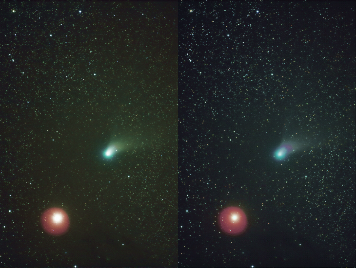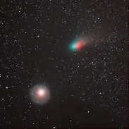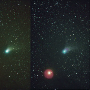 Three/D image of comet C/2022 E3 (ZTF) and Mars. Taken with an astro-modified Canon 60D, Canon 70-200mm lens, at 200mm f2.8. Stacks of 36, 15 second exposures at ISO 2500. A stereo pair taken 53 minutes apart, starting at 8:46 PM, MST. Also included an anaglyph requiring 3D glasses (red left, cyan right).