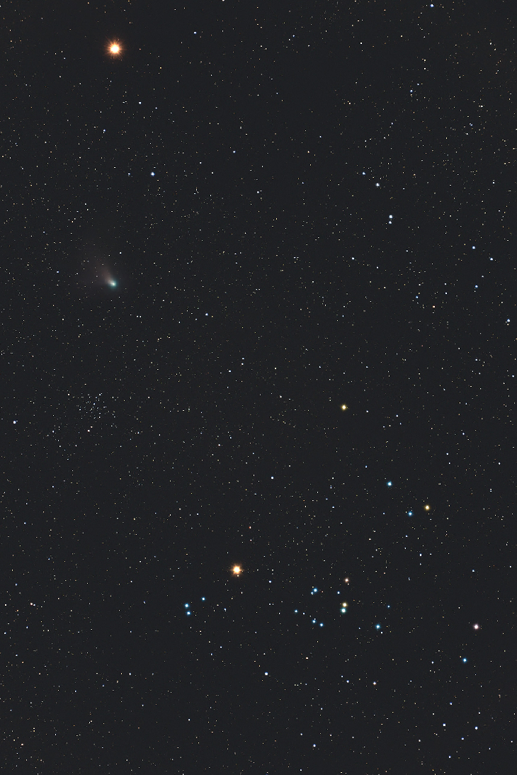 Comet C/2022 E3 ZTF between Mars and Hyades: February 11, 2023, 12 exposures of 90 seconds each with Nikon D7100 + Nikkor 105 mm, f:3.5 closed to f:5.6 and ISO 1600, on Star Adventurer star tracker. Top left planet Mars, below comet and bottom center Aldebaran and the Hyades