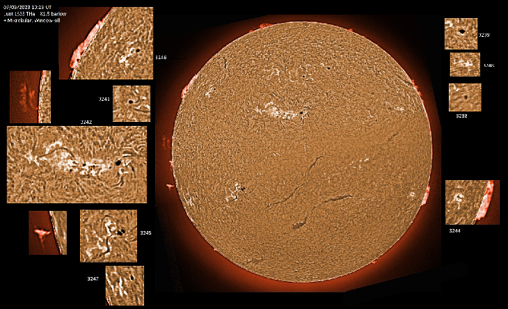 The light bridge across 3245 is very evident in H-alpha. Interesting prominence on the E limb.