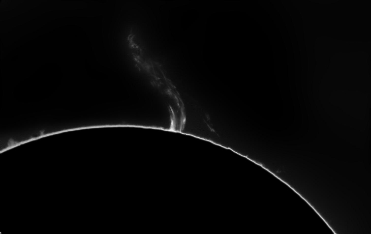 I planned on a quick imaging session of the sun. I always end my imaging runs with one last visual view. Today, that "one last view" turned into a sequence capture as I saw an interesting prominence had flared into a monster! The still is the prominence as of 20:32GMT. The animation covers a span from 20:32 thru 20:48GMT. Captured by a double-stacked Lunt LS80MT and a ZWOASI174MM.