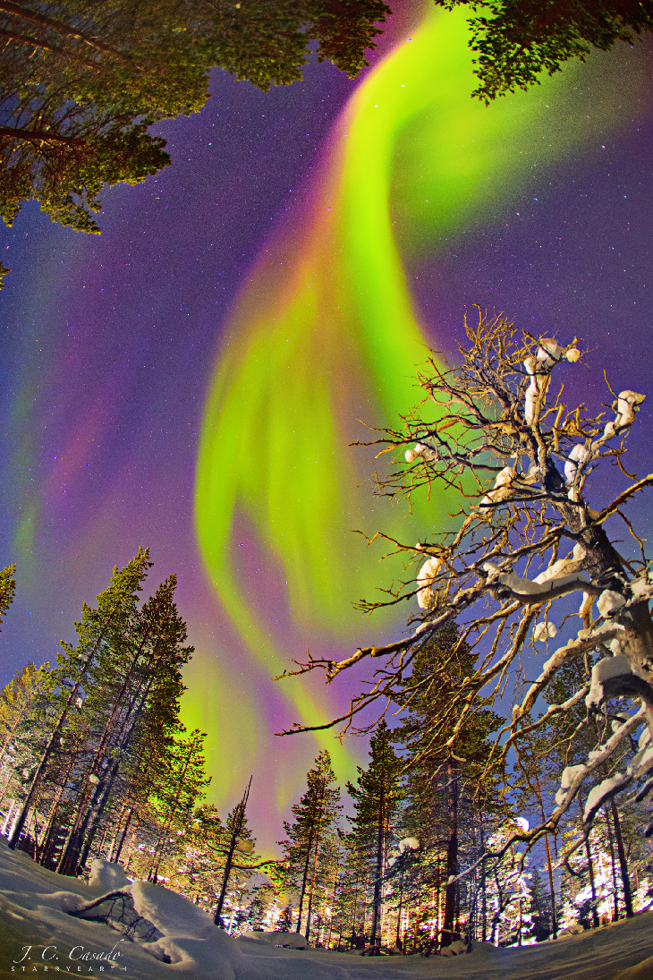 The phenomenon started appearing in the early evening in the form of diffuse auroras that gradually intensified in visibility and experienced several episodes of high activity, such as the one shown in the image.