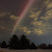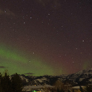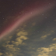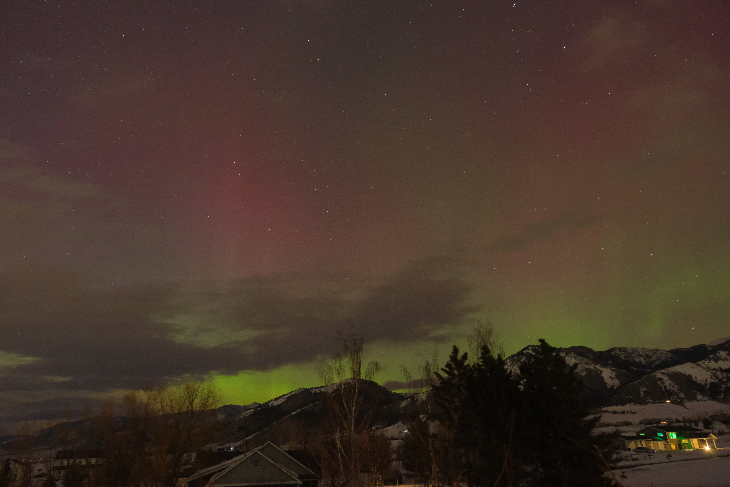 Aurora visible ~ 10pm MDT in the north and east over the Bridger Mtns before clouds obscured the view. Bright arc (STEVE?) across the sky from east towards the west, south of the zenith.