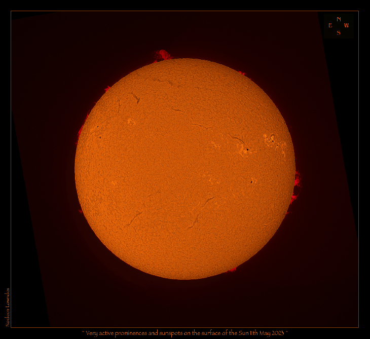 It was very exciting observing the Sun late yesterday afternoon, as there were some very active prominences around the solar limb. The one on the northern limb was very fine and looked like it may take off and detach, the other two on the western limb were starting to interact with one another and connect. And to make it more interesting there was another very large active prominence showing itself on the eastern limb…There was also a lot flaring around those two large sunspots AR3296 & AR329 on the solar surface Wow, it’s all very exciting now ☺ ☺ ☺ The images were captured with a Lunt 60mm solar scope and a Canon 700D camera with a 2x Barlow lens attached. 30 images were captured, one set for the solar disc and one set for the faint prominences and combined in PS CS4.