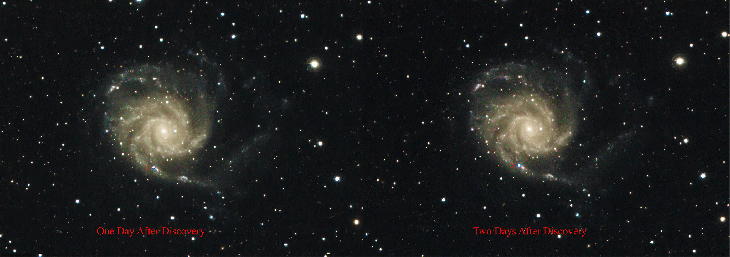 iTelescope T68 11 x 90 sec, both sets, images processed exactly the same and at same time to normalize all the other components of this image. The left image is 1 day after discovery and the right image is 2 days after discovery. The supernova is substantially brighter from about mag 14.5 to about 12 in comparison with the few stars in field.