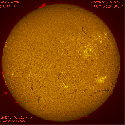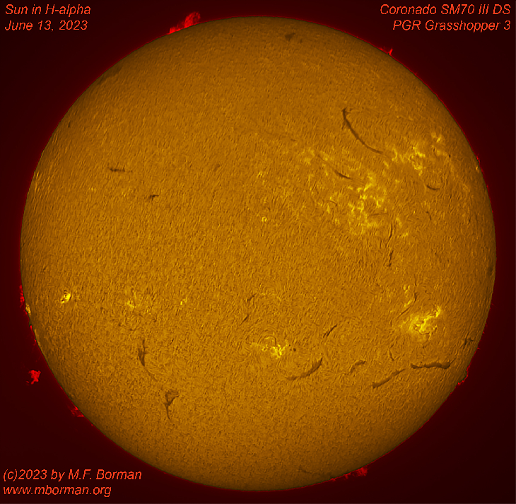 The object of interest on the Sun today was a detached prominence on the southeast limb of the Sun. Taken with a Coronado SM70 III DS h-alpha telescope on a Astro-Physics Mach2GTO mount. PGR Grasshopper 3 camera.