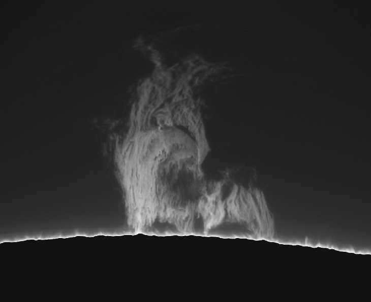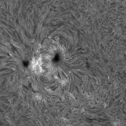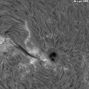 The sun was peppered with photogenic sunspots today (becoming quite common!). An added bonus was a nice big detailed quiescent prominence. 127mm f/9.4 refractor, Quark-C/Lunt tilt-tune double-stack filter (Quark only for prom), ASI174mm camera.