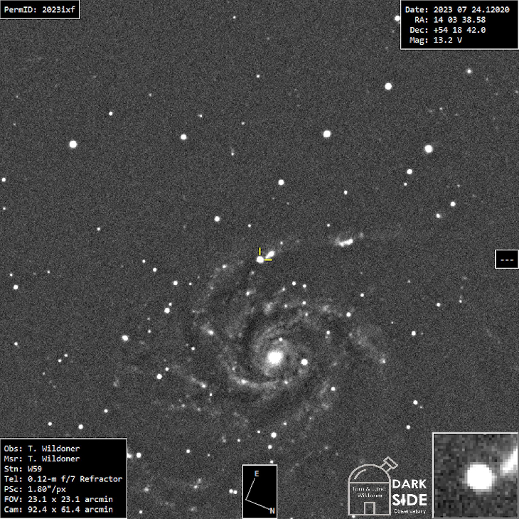 Here is an updated view of supernova 2023ixf in the galaxy Messier 101 (The Pinwheel Galaxy in Ursa Major). Tycho Tracker estimated the magnitude of the supernova to be 13.2 at the time of my observation, dimming further since my last observation on July 6, 2023