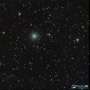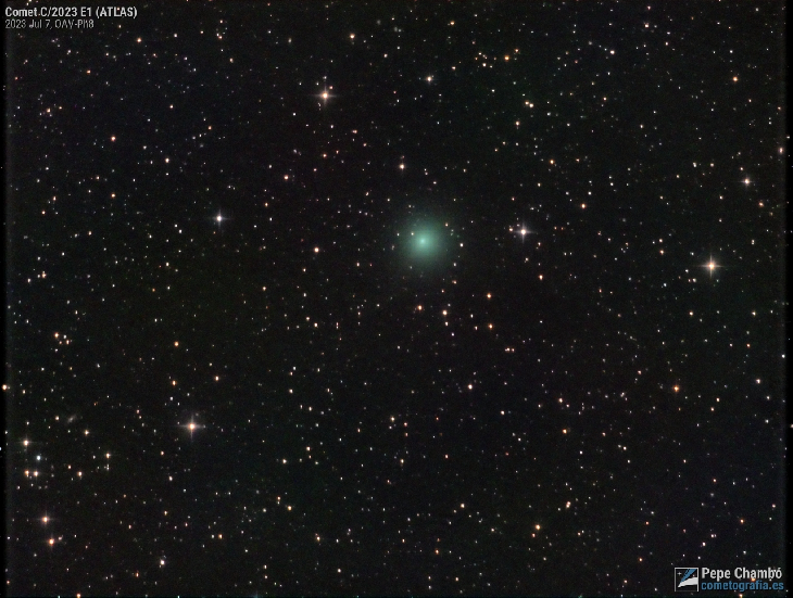 Comet C/2023 E1 (ATLAS) imaged on July 7, 2023, one week after its perihelion. With a brightness at magnitude 9.2 shows a green coma with gradual condensation and 8 arcminutes in angular size . Its ionic tail is faint, but can be seen in this image towards southeast (to down-left) with a lenght of more than 6 arcminutes.