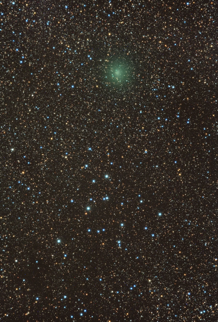 Piccola e debole cometa di colore verde passata sopra l'ammasso aperto M39 nel Cigno.