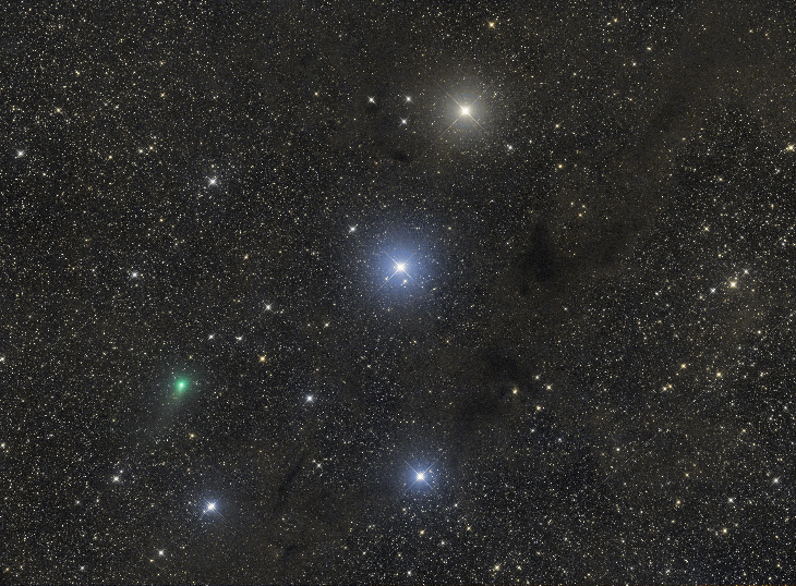 C/2021 T4 (Lemmon) passing by a dark nebula in Lupus (20 cm telescope Hakos H8 2.8, 2x180 sec. RGB each+3x180 sec. L) and C/2023 E1 (ATLAS) near a red emission nebula in Cepheus (40 cm Dream Astrograph Utah, 5x60 sec. RGB each+7x60 sec. L, separately for both the comet and background). Both comets were around magnitude 9-10 at the time of imaging, C/2021 T4 (Lemmon) being only a week after its perihelion. Data taken remotely through the system of Skygems Observatory Network from Namibia and Utah and mainly processed with Siril. Comet isolating was done in StarNet2, compositing comet-only and background images in StarStax, finishing touch (contrast, crop) in IrfanView.