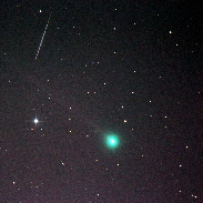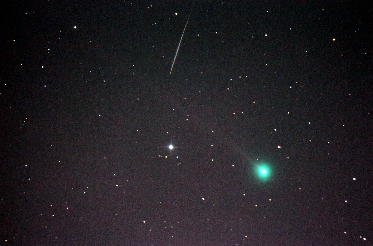 Just happened to catch a meteor coming at me while imaging the comet in a short window between trees. The bright star nearby is 6th magnitude HD68543 in Cancer.