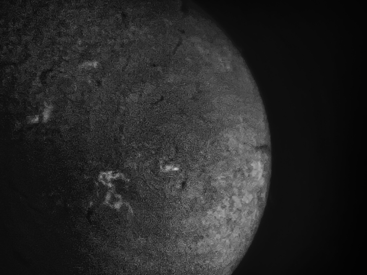 In center of disk AR 3421 is double sports with a lot of faculae in between. To boom left, AR 34210 is active, and to the left of it, new AR is coming to limb by tomorrow. Lunt 60 DS with B1200 Ha diagonal, 12mm Plossl, and iPhone 12s (monochrome and normal modes).